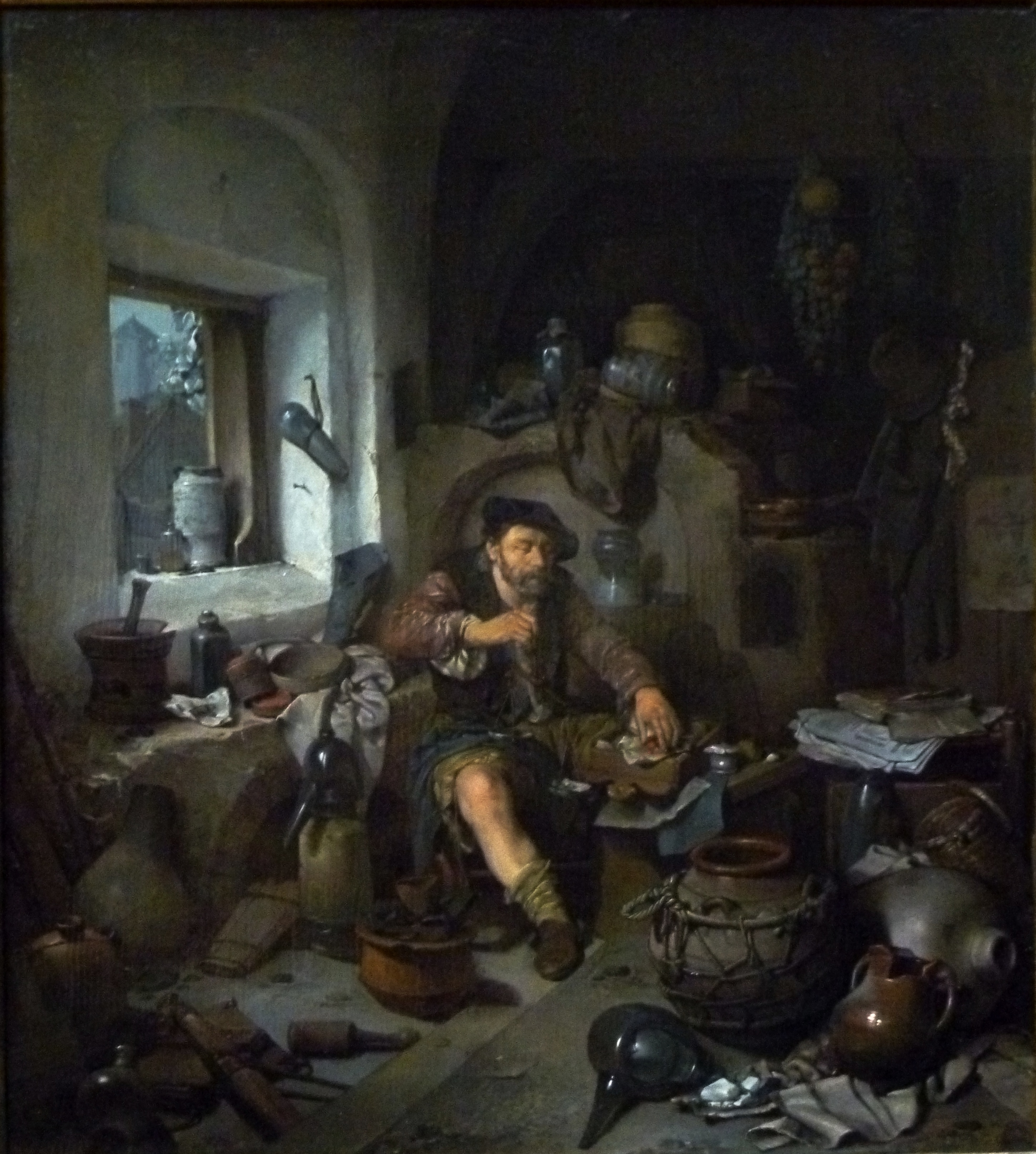 “Oblivious to his cluttered surroundings, the unkempt figure of an alchemist sits among a chaotic jumble of paraphernalia. He holds a scale while weighing out a substance for one of his experiments in making gold. By the seventeenth century, alchemy was no longer considered to be a respectable science, and its practitioners were often the subject of ridicule. ”