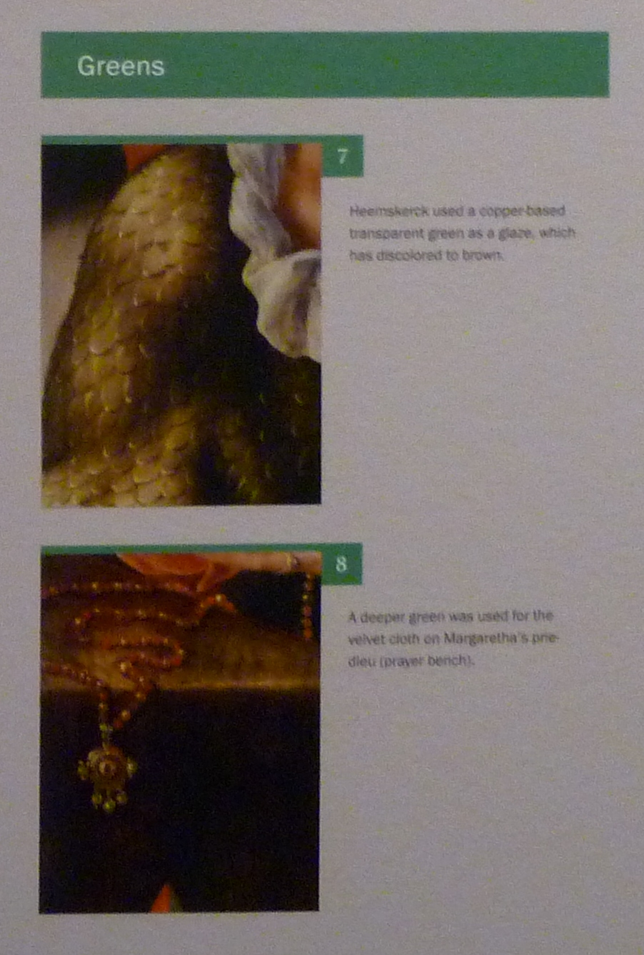 Another thing that surprised me was Girl with a Pearl Earring‘s eye color; they are not light golden brown, or blue, or green, or gray. They are gray-blue with the absolute slightest hint of light golden brown, so difficult to describe. I stood there trying to figure out how he accomplished that and if I were trying to duplicate that color without causing the eyes to become greenish, I would paint them gray-blue first, let them dry completely, and then ever so gently, glaze just a small part of the reflected light area of the iris with a golden brown glaze. I still can’t imagine how Vermeer really did it, but that would be how I would approach it.