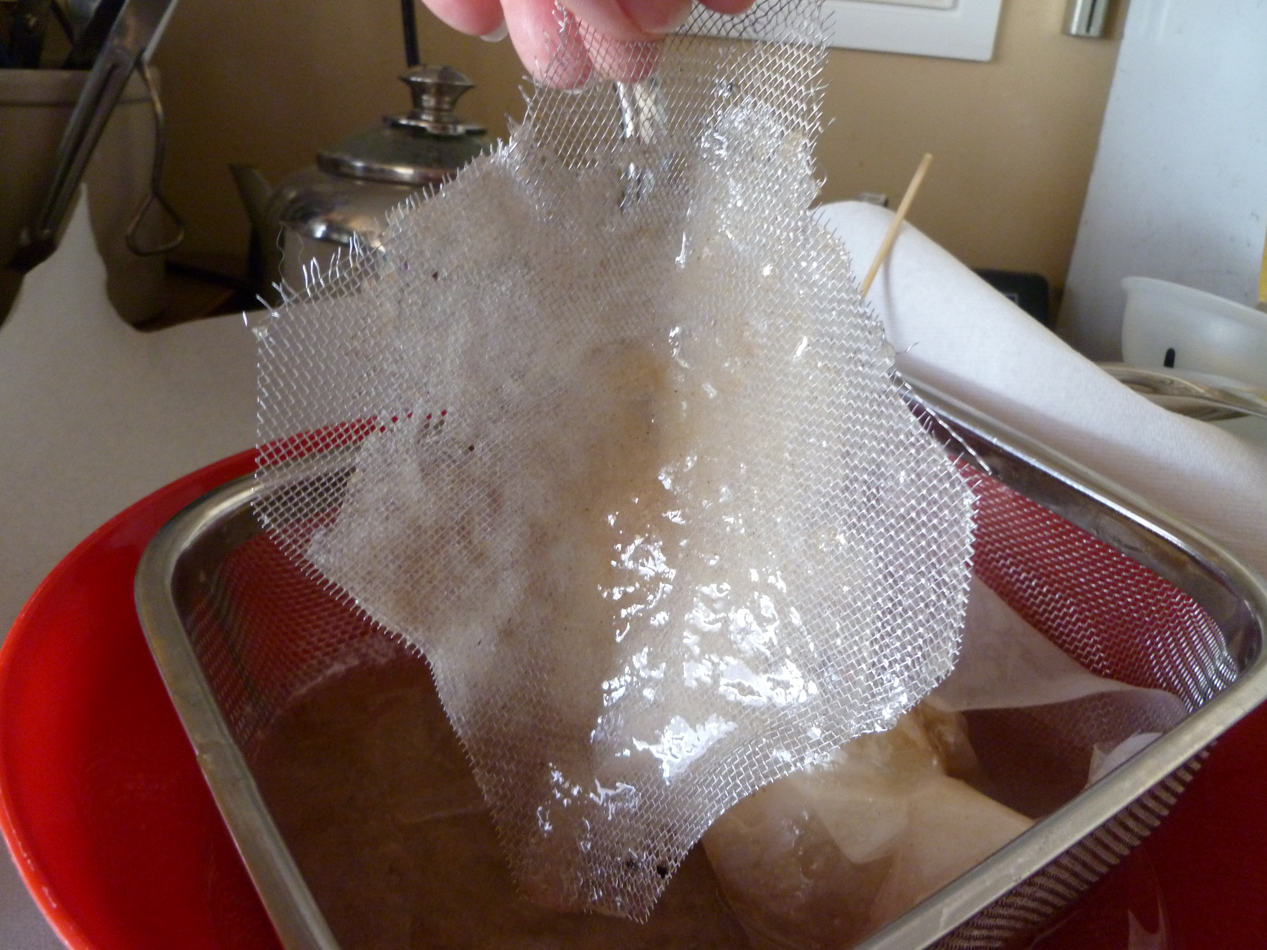 d. Both decantings need to be filtered a final time with a funnel using a coffee or cotton ball filter. The cotton seems to work better and faster–the coffee filter is too fine. It takes a couple of hours to completely drain and it should be clear with no water; if not, do it again. Also, drain the psyllium separately in a colander over a bowl for a couple of days—you’ll recover lots of good oil.
